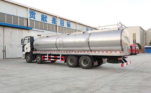 前四后八20吨鲜奶物流车,保温层采用进口轻质加厚聚氨酯整体发泡保温,发泡密度42KG/m³,厚度为80-100mm,注料混合精确,发泡细腻均匀,具有重量轻,保温效果好等特点,解决了人工发泡的泡沫密度过小,泡壁过薄,容易消泡等缺陷,在常温条件下运输液态食品30度温差时24小时温度变化不超过1度。