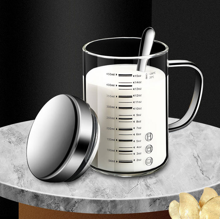 高硼硅玻璃牛奶杯家用带刻度耐高温水杯可微波加热办公室饮水杯 大号450ML带盖